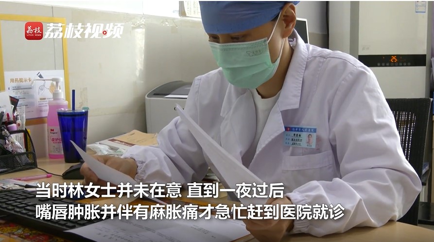 经由医师会诊,林女士右侧颊粘膜被蜈蚣咬伤,高下嘴唇肿胀的相比锐利。